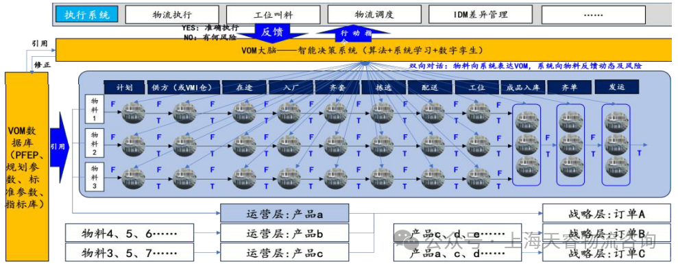 在VOM體系,要能夠做到切實執(zhí)行物流的執(zhí)行工位的叫料、物流的調(diào)度作業(yè)過程的差異管理。VOM的數(shù)據(jù)庫和PFEP規(guī)劃參數(shù)標準、參數(shù)指標庫,兩者之間互為前提、互為引用和修正關系,同時能夠引用,能夠反饋,也能夠集成物料的聲音。從技術支撐而言,它可以通過數(shù)字孿生、人工智能數(shù)字主線、機器人技術、算法、物聯(lián)網(wǎng)技術、大數(shù)據(jù)、物流技術、信息技術、自動識別技術、傳感技術等做有效支撐。所以,VOM 的系統(tǒng)邏輯核心是基于VOM的智能監(jiān)測系統(tǒng),通過模型算法、系統(tǒng)學習和數(shù)字孿生不斷的迭代,提升智能化水平,逐步實現(xiàn)物料的自主指揮系統(tǒng)。